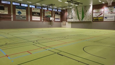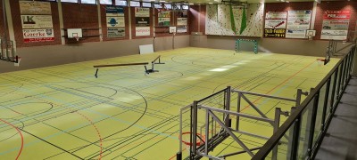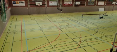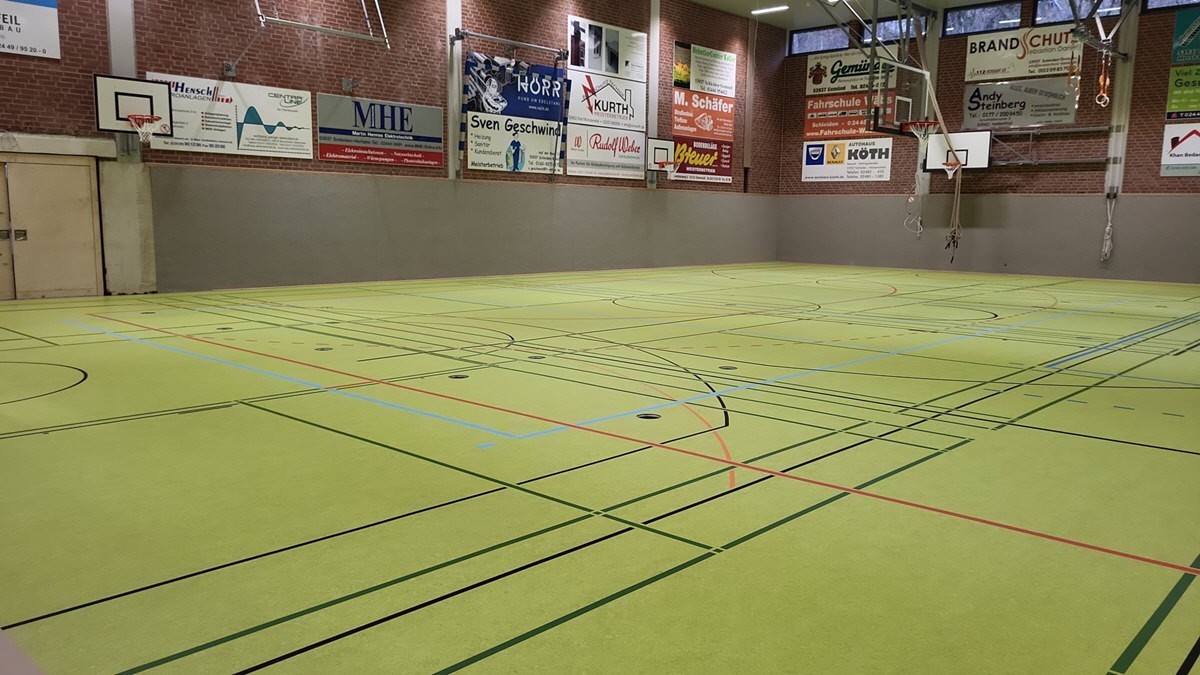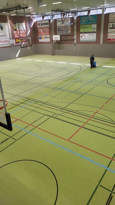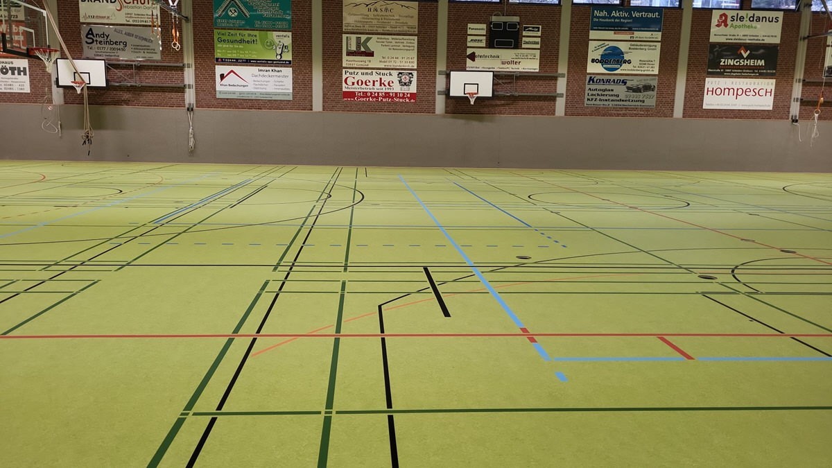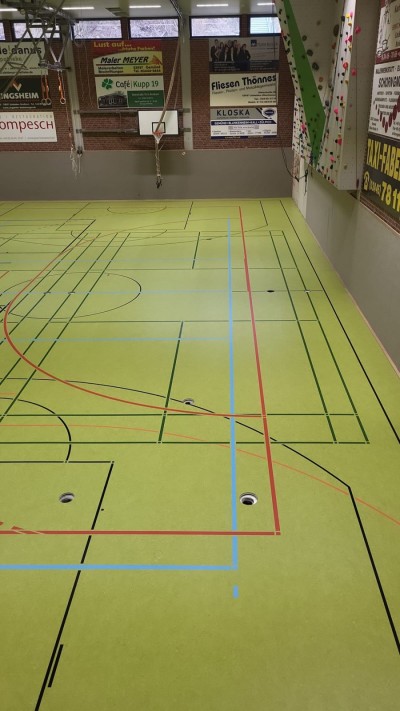 - ca. 1350 qm flächenelastischen Sandwich-Sportboden verlegen mit Sportlinoleum-Oberbelag