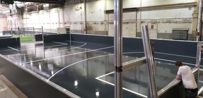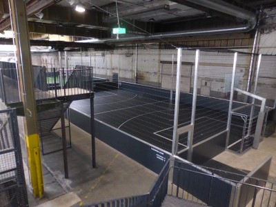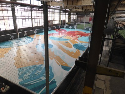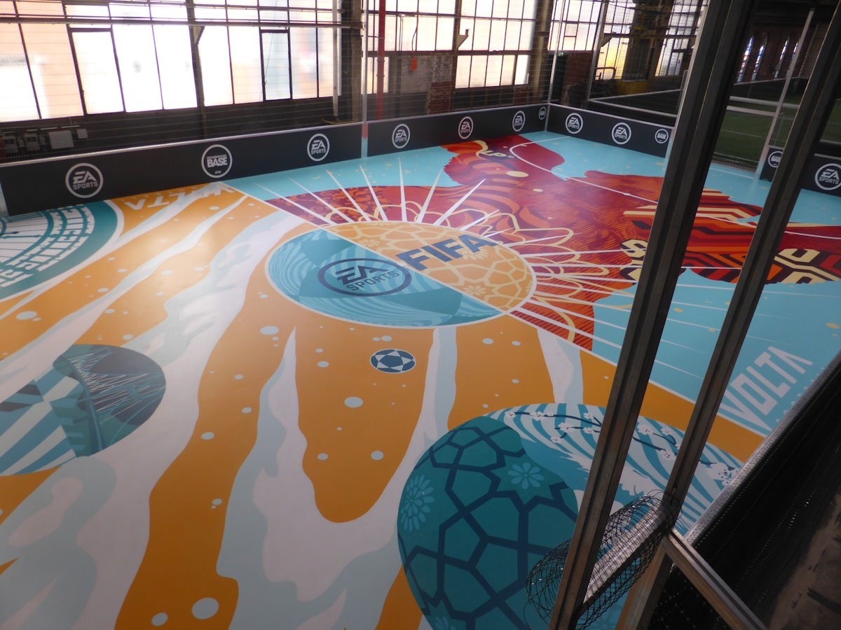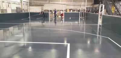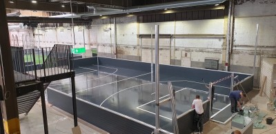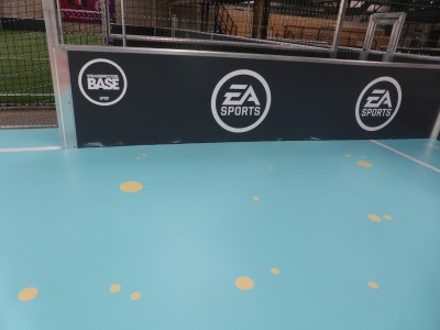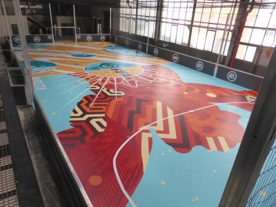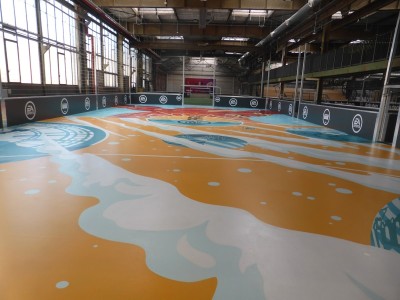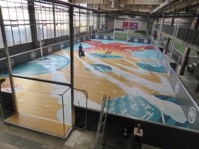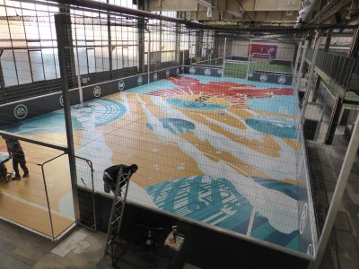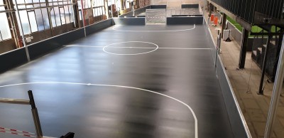 - Verlegen von 2 Soccercourts, 4 mm starker Sportlinoleum als Oberbelag. Ein Platz wurde später von englischen Künstlern in bunten Farben gestaltet.