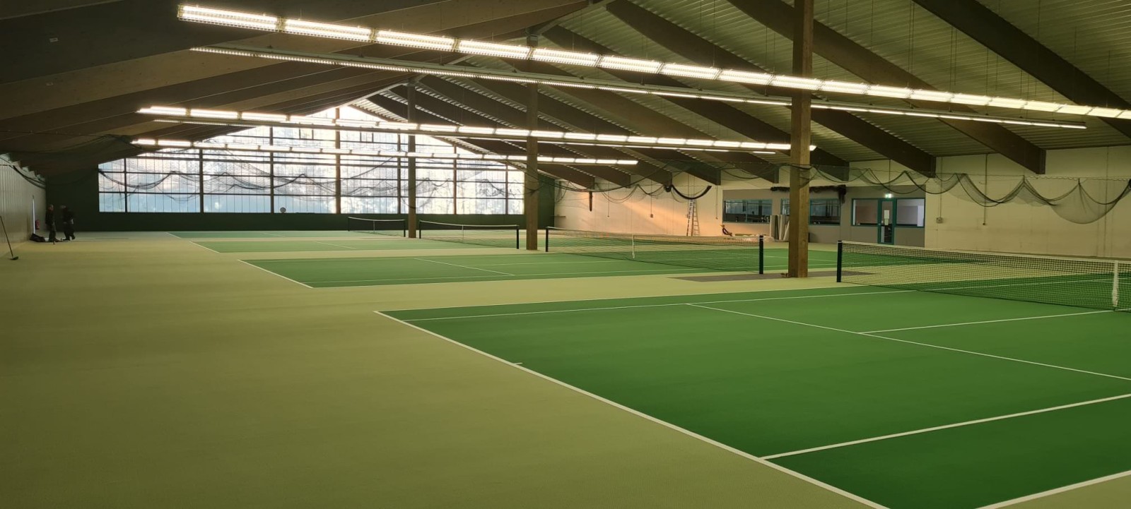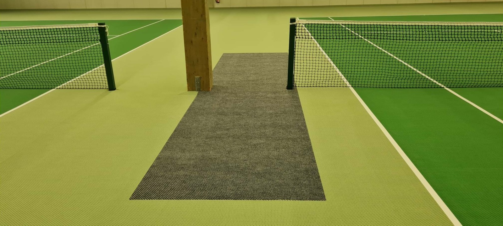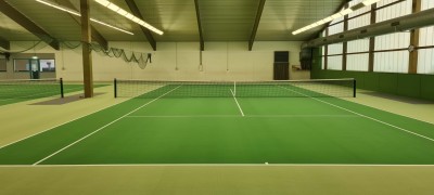 - Tennisvelourbelag, zweifarbig mit den Tennis-Spielfeldmarkierungen verlegen